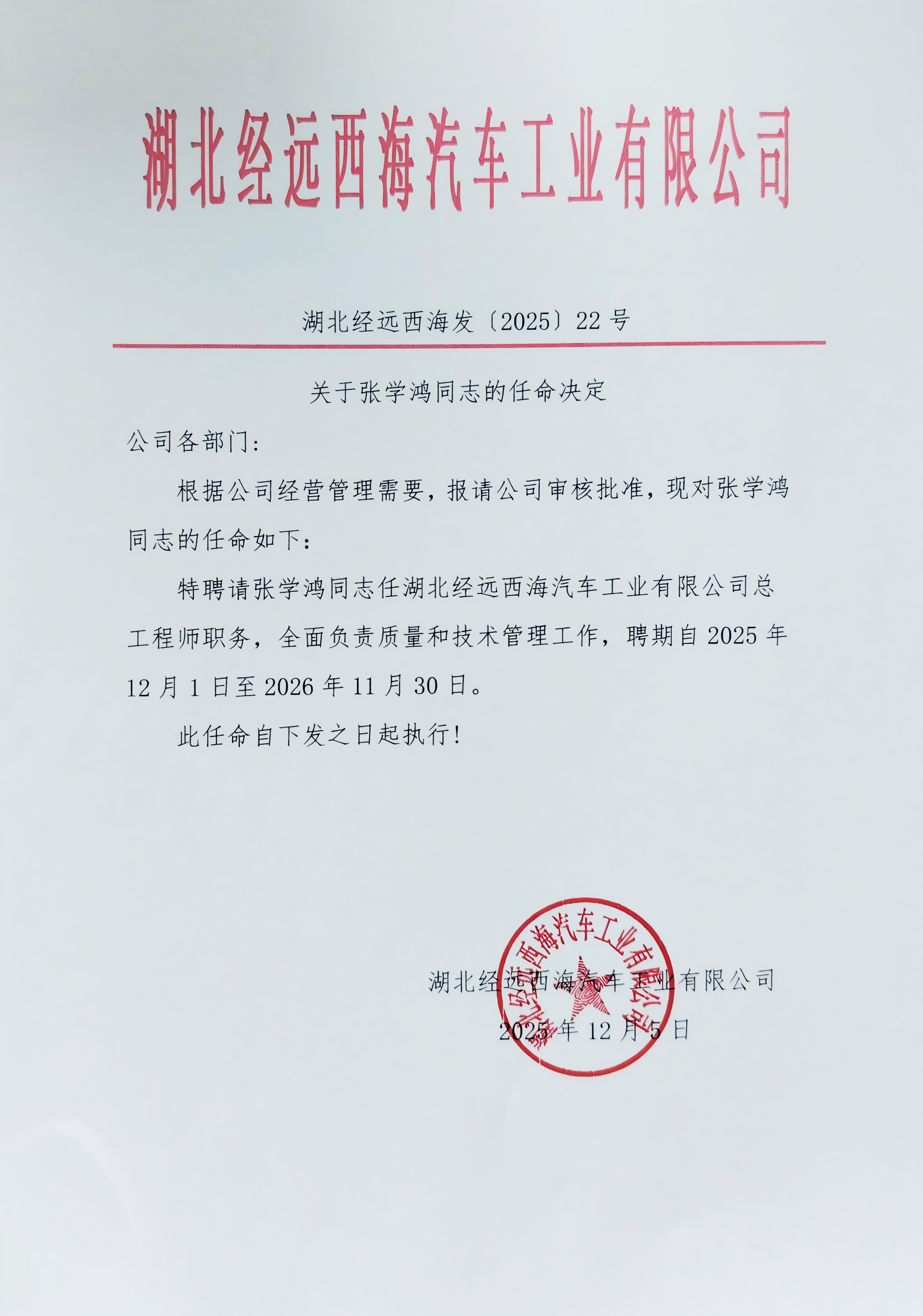 公司各部門:根據公司經營管理需要,報請公司審核批準,現對張學鴻同志的任命如下:特聘請張學鴻同志任湖北經遠西海汽車工業有限公司總工程師職務,全面負責質量和技術管理工作,聘期自2025年12月1日至2026年11月30日。此任命自下發之日起執行!